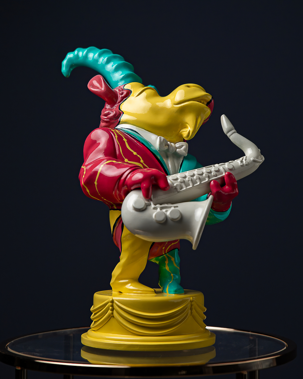 The “Capricorn –The Fool’s Theatre Zodiac” statuette embodies determination, discipline, and inner strength. The image of a musician playing a wind instrument symbolizes focus, mastery, and the steady ascent toward achievement. Bold color contrasts and expressive sculptural form turn this piece into a powerful zodiac-inspired art object.